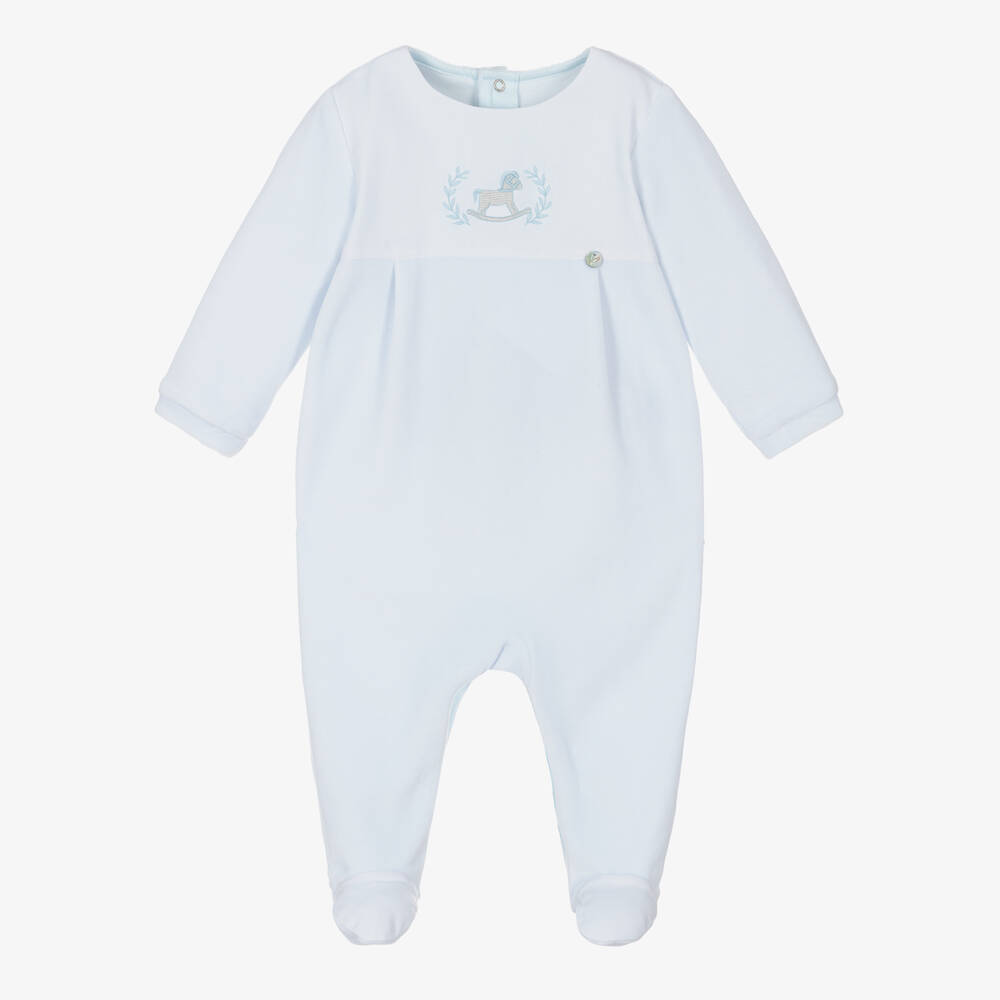Lovely pale blue babygrow for little boys by Pureté Du... Bébé, made in luxurious cotton-blend velour. Embroidered with a cute rocking horse motif on the chest, this babysuit is soft and gentle against the skin. There are popper fastenings on the back and between the legs to help with easy dressing. A sweet mother-of-pearl logo charm can be seen on the front.