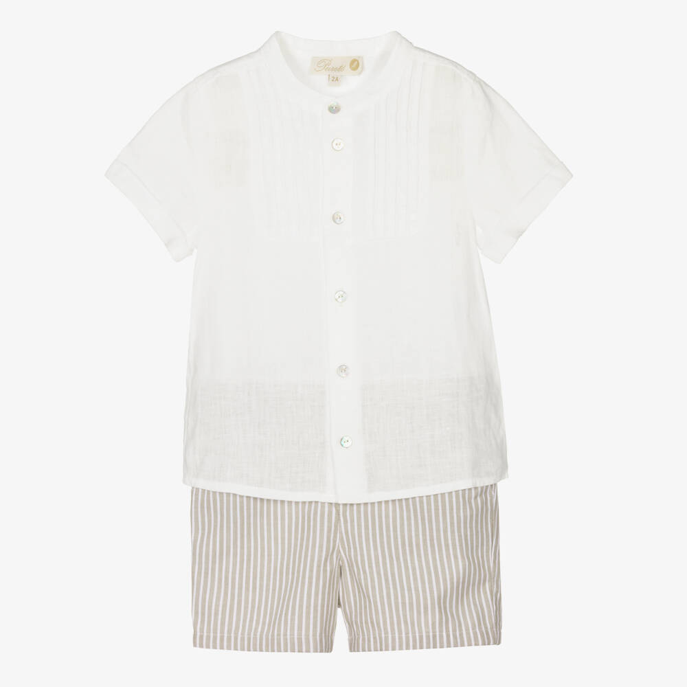 Traditionally styled beige and ivory striped shorts set for little boys by Pureté Du... Bébe. Made in cool and comfortable linen, the ivory collarless shirt has pintuck detailing on the chest, with classic mother-of-pearl button fastenings down the front. The cotton shorts are gently elasticated around the back and have an adjustable waist for the best fit. Fastening with a single button on the front, they have slanted side pockets and a branded tab sewn on the back.