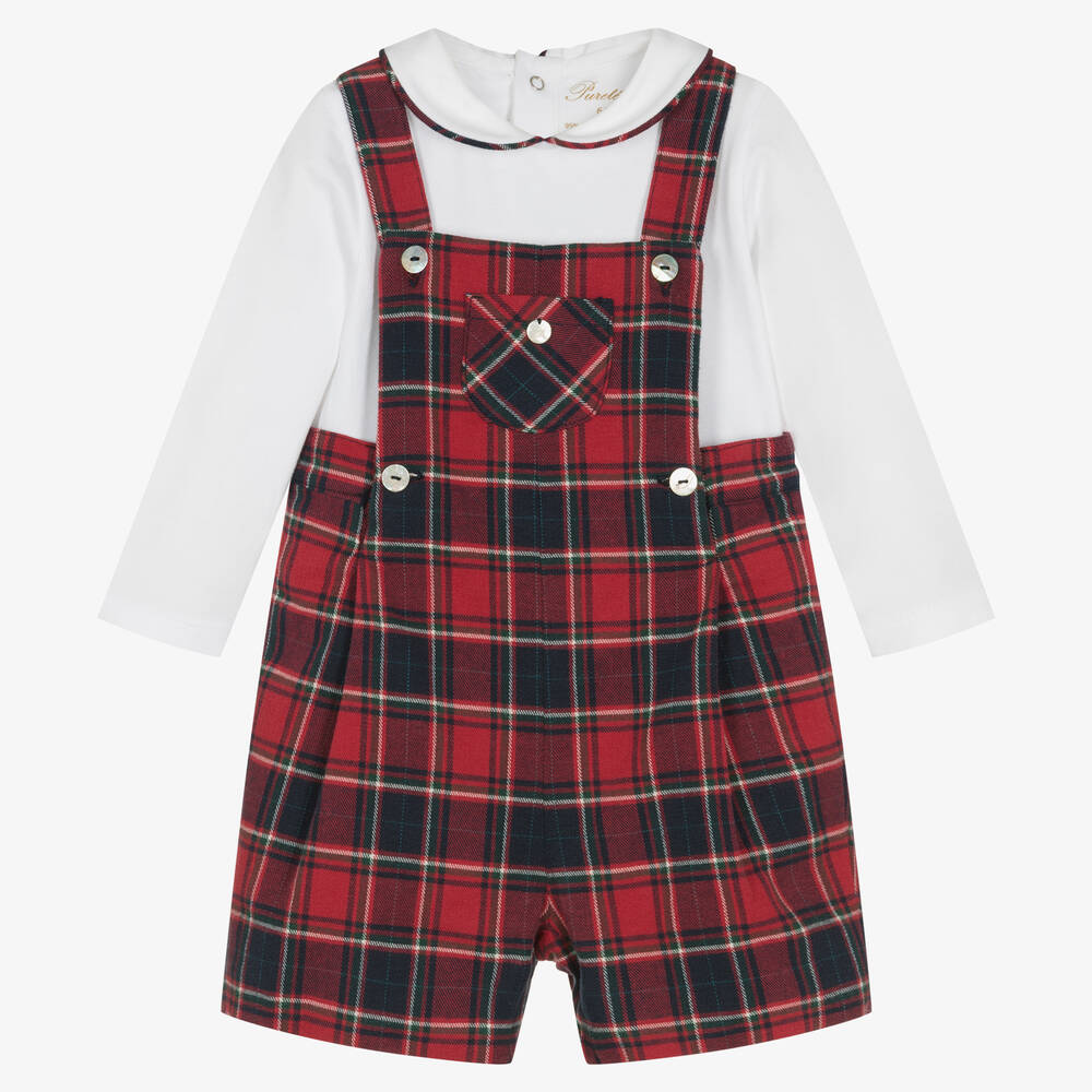 In a smart red and navy blue tartan check, this lovely dungaree shorts set for little boys is by Pureté Du... Bébé. The traditional dungarees are styled with front pleats and a chest pocket with a tiny mother-of-pearl logo charm. They fasten with mother-of-pearl buttons and have adjustable shoulder straps. They pair with a white cotton jersey bodysuit that has a rounded twill collar and tartan trim for a sweet coordinated look.
