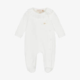 White and blue babygrow for boys by Pureté Du... Bébé, made in soft cotton jersey. Featuring a charming Toile de Jouy print trim on the collar and cuffs, it adds a classic touch to the design. There are lovely mother-of-pearl buttons on the front and practical popper fastenings between the legs.
