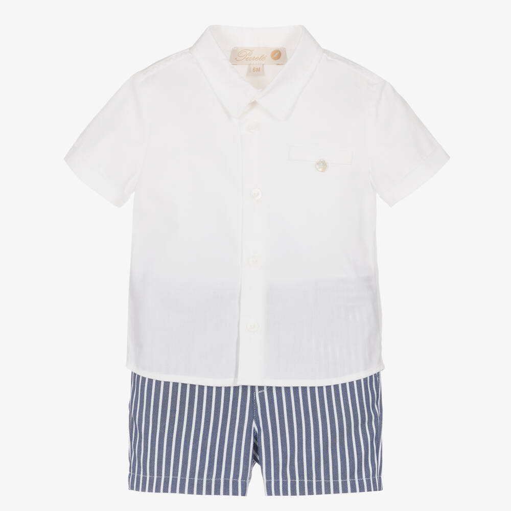 A classic blue and white striped shorts set for little boys by Pureté Du... Bébe. The white cotton shirt has pearlised button fastenings down the front, with a signature mother-of-pearl logo charm on the faux chest pocket. The cotton-blend shorts are gently elasticated around the back and have an adjustable waist for the best fit. Fastening with a single button on the front, they have slanted side pockets and a branded tab sewn on the back.