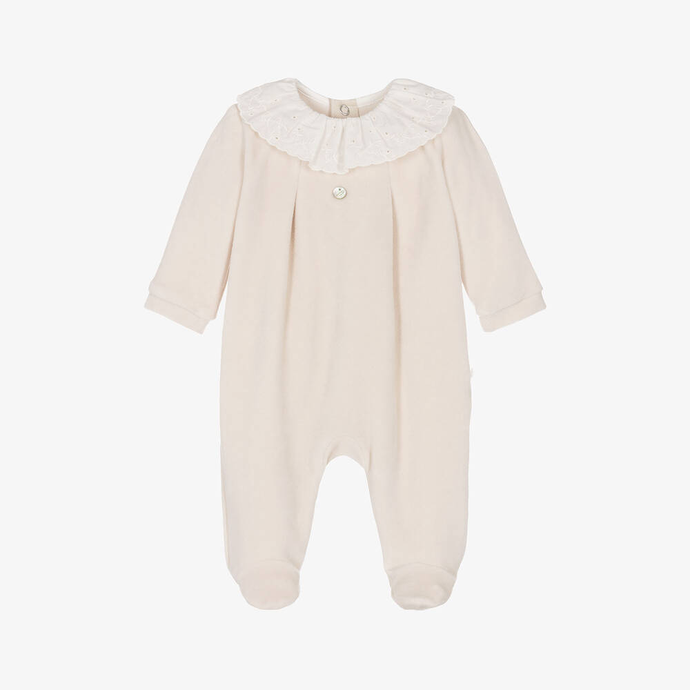 A lovely beige babygrow for girls by Pureté Du... Bébé, made in beautifully soft cotton velour. Cosy and warm with enclosed feet, it is traditionally styled with a delicately embroidered white ruffle collar. A little mother-of-pearl logo charm trims the front and it fastens on the back and between the legs with poppers.