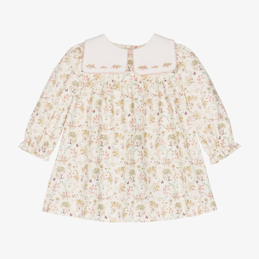 A delightful ivory dress for younger girls by Pureté Du... Bébé, patterned with a pretty pink and green floral design. A traditional style, it has a little collar with delicate floral embroidery and a pink picot trim. The bodice is detailed with a mother-of-pearl logo charm and the long sleeves have gently elasticated frilled cuffs. Fully lined in lightweight voile for comfort, it fastens neatly on the back with matching buttons.