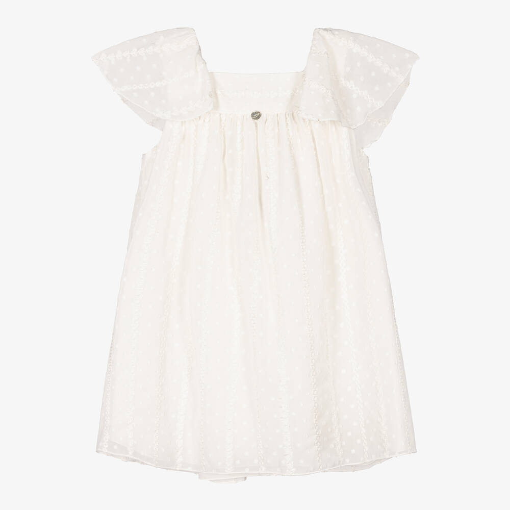 Lovely for a special occasion, this elegant ivory dress for little girls is by Pureté Du... Bébe. It is made in sheer lightweight chiffon, pattered in delicate dots and beautiful embroidery detailing. There are pretty flutter sleeves and a signature mother-of-pearl logo charm on the front. Lined in lightweight cotton voile for comfort, the dress fastens discreetly with a concealed zip on the back.