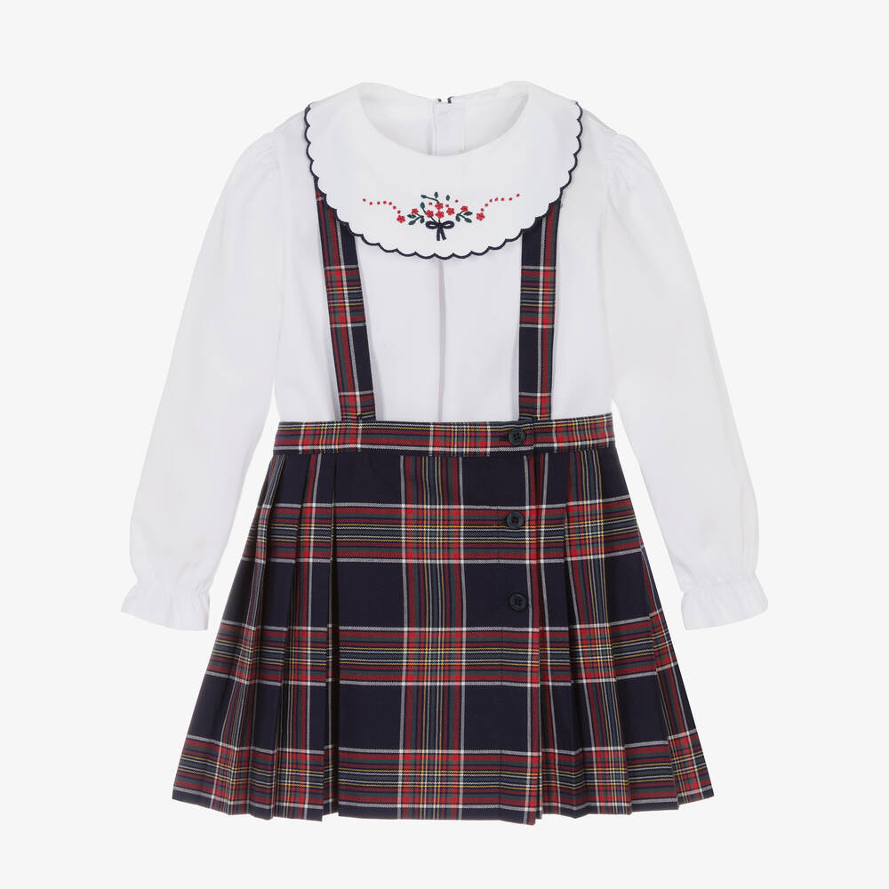 Charming navy blue tartan skirt set for little girls by Pureté Du... Bébé. Made in smooth cotton twill, the white blouse has a pretty scalloped collar with floral embroidery. The pleated, wrap-around skirt has detachable and adjustable straps for a preppy look and fastens with buttons.