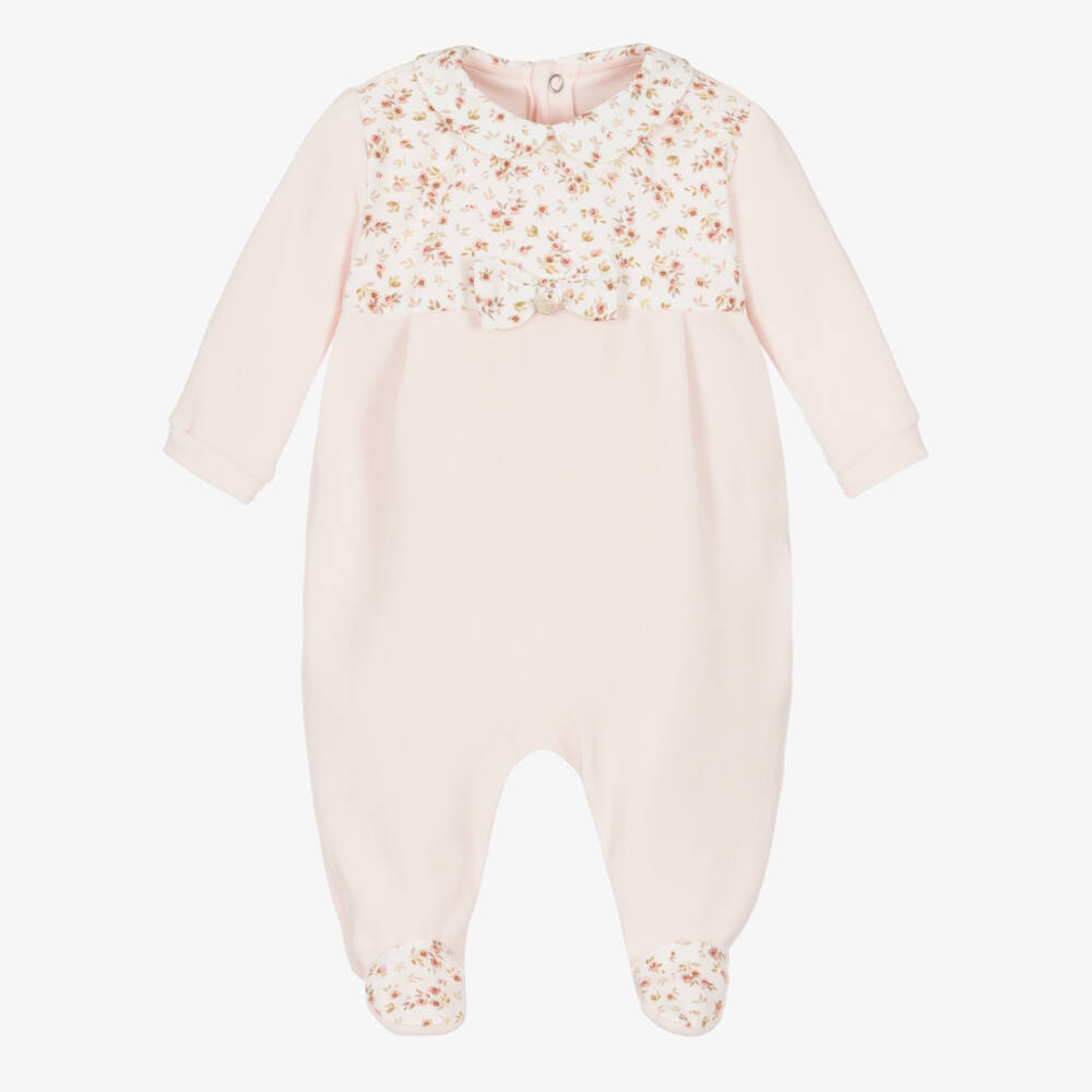 Sweet pink cotton babygrow for girls by classic Portuguese brand Pureté Du... Bébé, made in super soft velour. It has a twill Peter Pan collar and bodice patterned with flowers in pink and green, with a matching bow and feet. The bow has a pretty, mother-of-pearl logo charm sewn on the front and there is a logo tab on one side seam. The babygrow fastens with poppers on the back and between the legs.