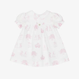 A sweet white coton dress for baby girls by Pureté Du... Bébé, with pretty pale pink trims. Lovely for afternoons in the sunshine, this charming piece has a frilly collar and romantic rose buds embroidered on the layered bodice. It has short puffed sleeves and mother-of-pearl button fastenings on the back for a neat finish.