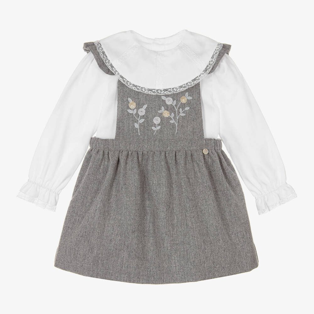 A charming white blouse and grey dress set for little girls by Pureté du... Bébé. Beautifully soft, the grey pinafore style dress, is made in a cosy wool blend with ruffe trims over the shoulders. It has pretty floral embroidery and sequins on the front and fastens on the back with a zip. The white cotton blouse has a rounded collar and elasticated cuffs, trimmed with delicate lace. It fastens neatly on the back with buttons. For a discreet designer finish, both pieces feature the brand's mother-of-pearl logo charm.