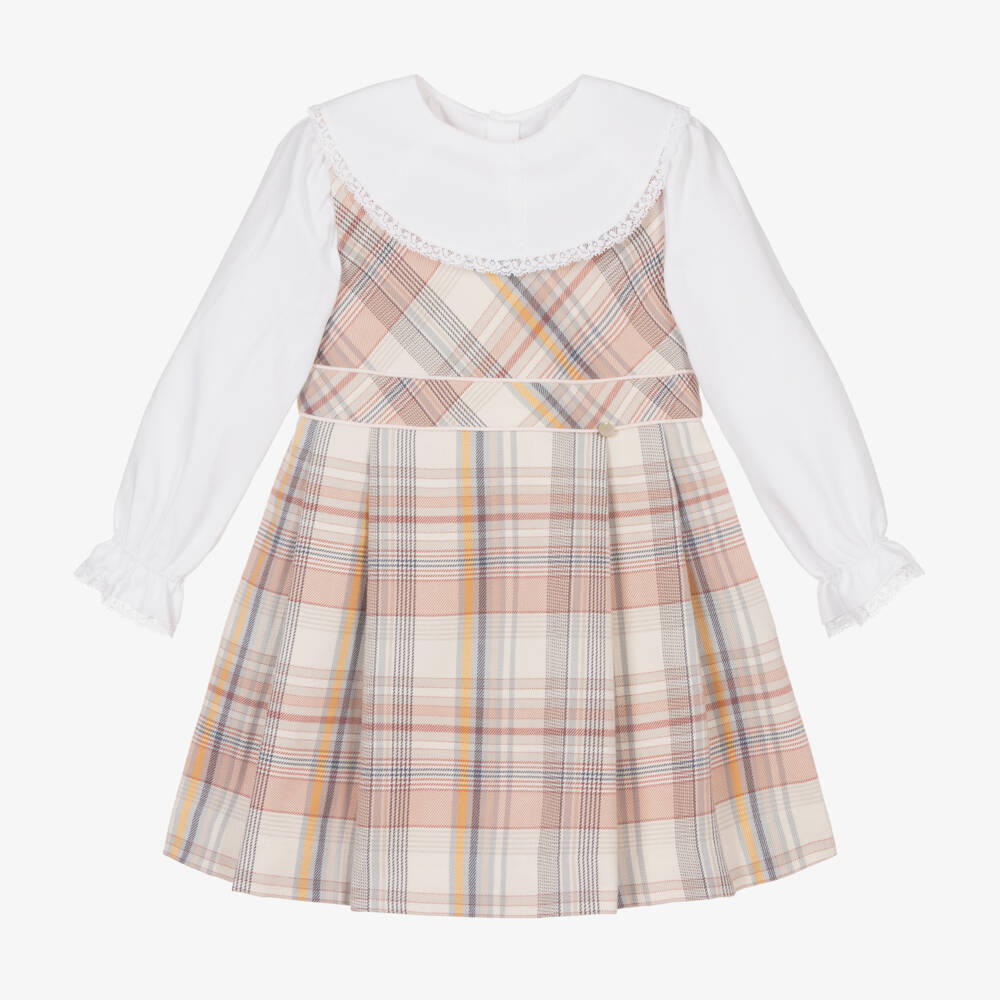 Girls White & Pink Checked Cotton Dress Set