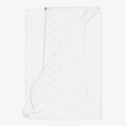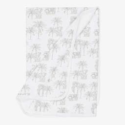 This lovely ivory blanket for baby boys and girls by Pureté Du... Bébé, is made in soft cotton velour. Cosy and warm, it is ideal for use in the pram or stroller. It is gently stretchy and lightweight, with a charming toile de jouy pattern in green on the top border.
