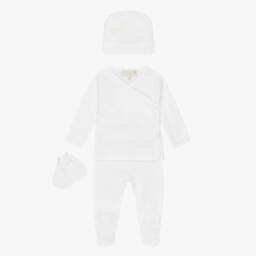 A charming ensemble for newborns, this ivory babysuit set for boys and girls is by Pureté Du... Bébé. Made in soft and cosy velour, it comprises a popper-fastening babygrow with lovely scalloped detailing, a matching hat, and a blanket with a sweet ribbon bow and logo charm in one corner.