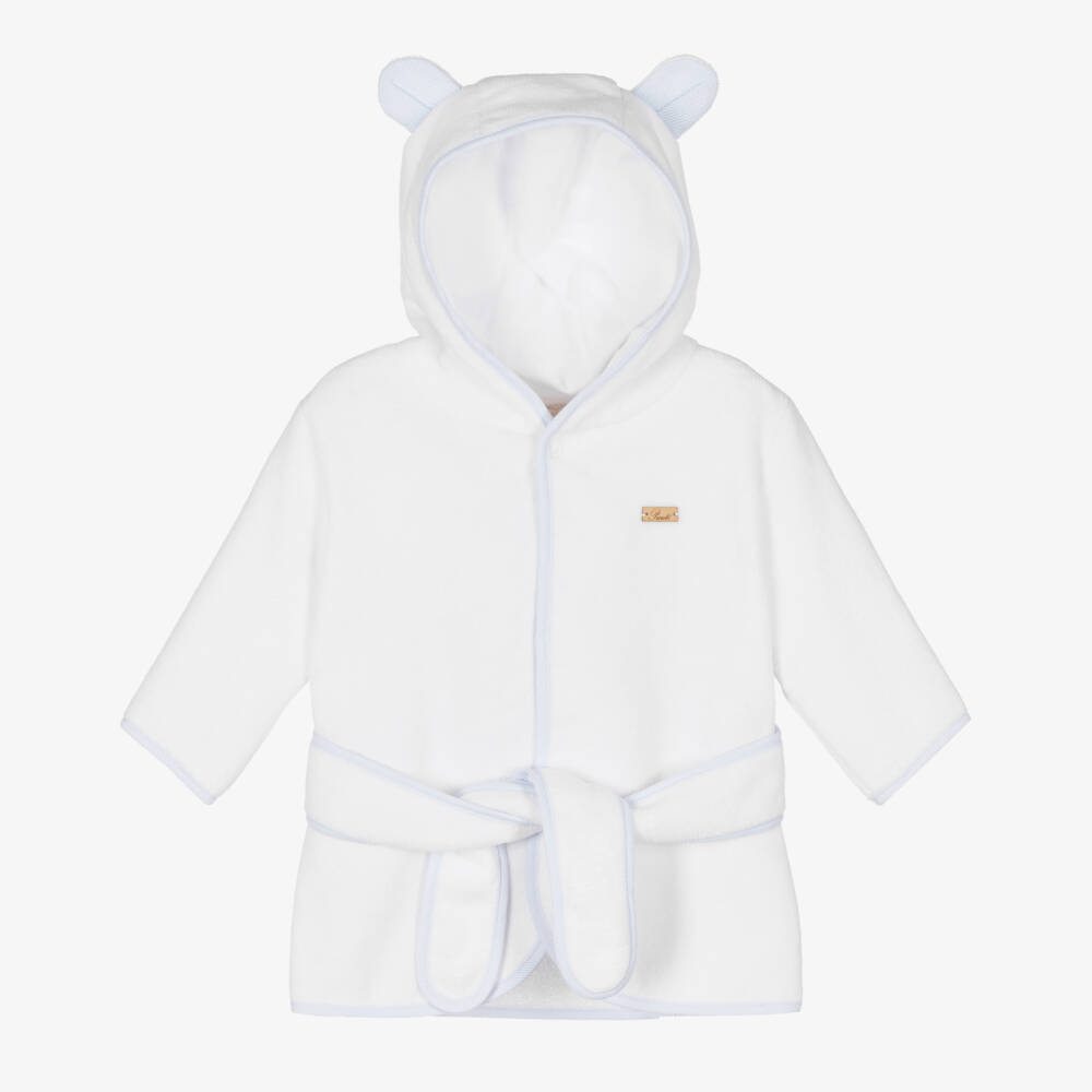 Lovely white hooded bathrobe for little boys and girls by Pureté Du... Bébe. It is made in beautifully soft cotton towelling, with blue striped trims. Fluffy and absorbent, it is just right for little ones to dry off and feel cosy and comfortable. There is fixed tie belt and a branded tab on the chest.