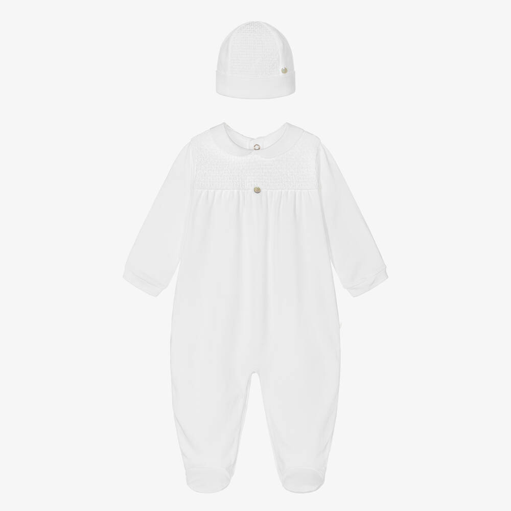 A lovely white babygrow set for boys and girls by Portuguese brand Pureté Du... Bébé. Made in soft cotton jersey, both pieces have pretty smocked detailing and a delicately branded mother-of-pearl charm. The long-sleeved babysuit has a classic Peter Pan collar and fastens easily with poppers on the back and between the legs. The matching hat has a sweet turned-up brim.