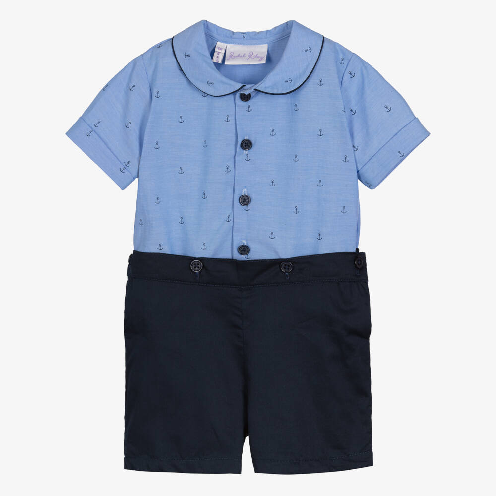 Baby boys buster suit by British heritage brand, Rachel Riley. This two-tone blue outift includes a smart shirt with an anchor theme and front button fastenings. The navy blue coordinating shorts attach to the shirt at the front and back with buttons for a smart, neatly tucked-in finish.