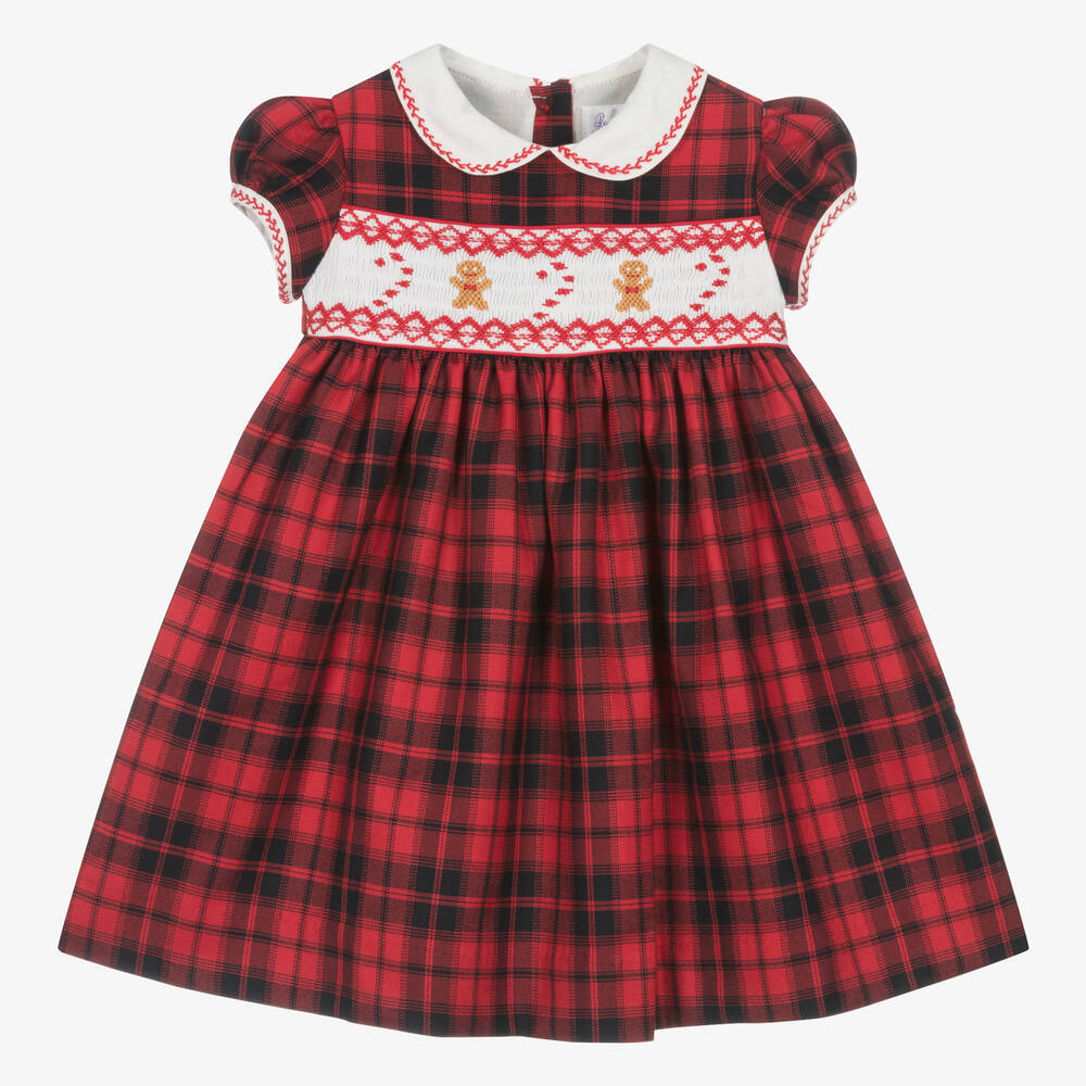 A charming traditionally-styled red tartan dress for baby girls by British brand Rachel Riley. Woven in soft twill fabric, it has a white smocked panel across the chest, with beautifully hand-embroidered little gingerbread men. It has pretty puffed sleeves and a white Peter Pan collar, both trimmed with red embroidery detailing. Lined in cotton voile for comfort, the dress has button fastenings on the back and comes with a pair of matching tartan knickers.