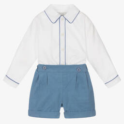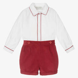 Traditional burgundy red shorts set for boys from Rachel Riley, made in soft cotton. The ivory shirt is made from a soft piqué and has a smart collar, red trims and fastens with buttons down the front. The coordinating burgundy red shorts are made in soft corduroy and have turn-up cuffs and a partially elasticated waistband for a comfortable fit. This smart set fastens together with buttons, so the shirt will always stay neatly tucked in.