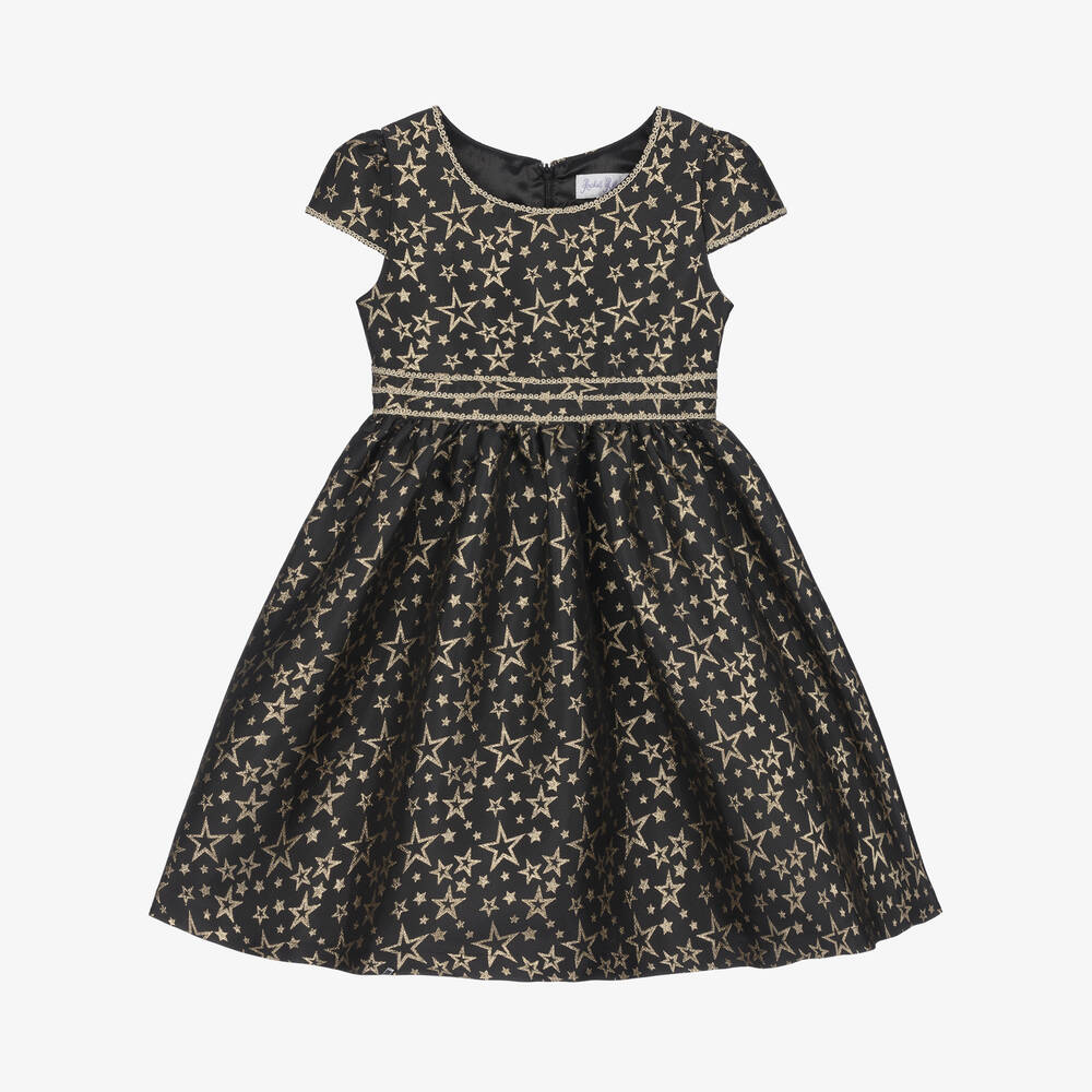 Sparkling black and gold dress for girls by Rachel Riley, ideal for special occasions and parties. The shimmering gold jacquard star pattern beautifully twinkles in the light, whilst the bodice is trimmed with intricate gold embroidery. Lined in lustrous satin, it fastens discreetly with a hidden zip on the back for a seamless finishing touch.