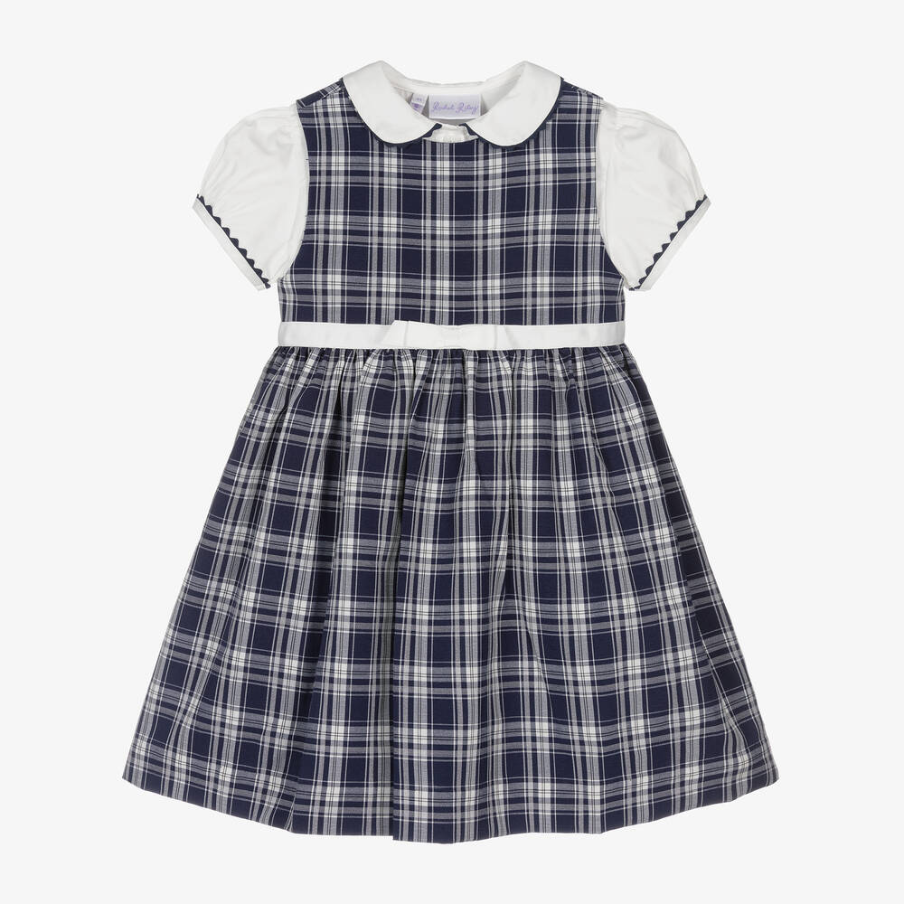 Smart navy blue pinafore dress set for girls by Rachel Riley. The cotton poplin blouse has puffed sleeves, a rounded collar and scalloped edging. It beautifully layers underneath the check pinafore dress for a classic, heritage look. The dress has a satin bow waist, button fastenings on the back and a soft cotton lining, completing the outfit with comfort.