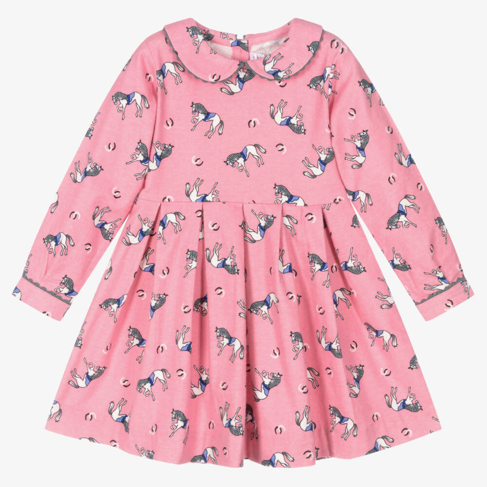 A lovely pink dress for girls by British brand Rachel Riley, made in beautifully soft cotton flannel. Patterned with a white, blue and grey horse print, it has a pleated skirt and grey ric rac trims on the collar and cuffs. The dress fastens with buttons and a sash tie on the back.
