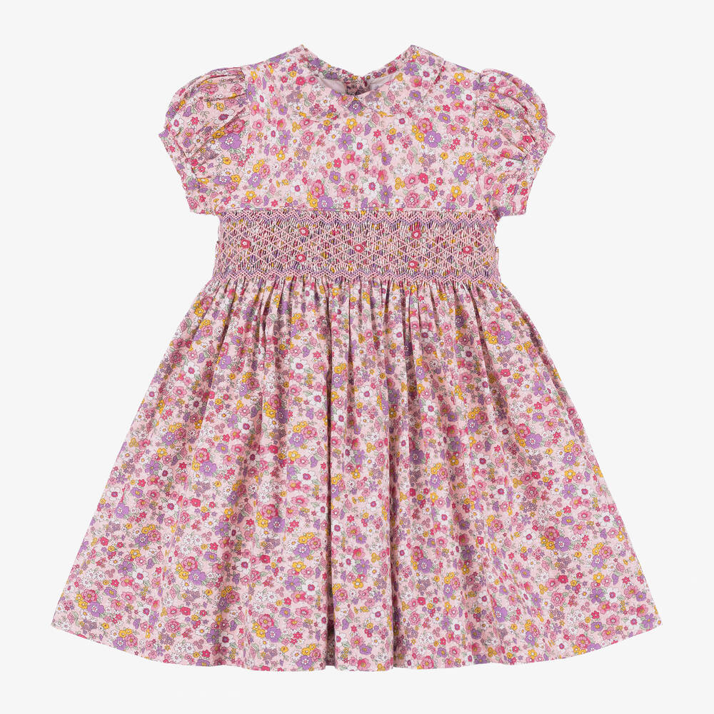 Pretty pink floral dress for girls by Rachel Riley, the traditional British designer. Softly woven in cotton poplin, this classic dress has puffed sleeves, a rounded collar and heritage floral smocking across the bodice. The gathered skirt beautifully flares into an elegant shape, and is lined in soft cotton voile for comfort. Pink button fastenings and a tie-up bow on the back complete the style.