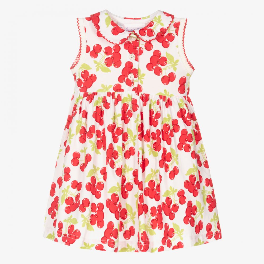 Cute white and red cherry print dress for baby girls by Rachel Riley, made in soft cotton jersey. This sweet dress has an empire waistline, red scalloped embroidery trims and front button fastenings.