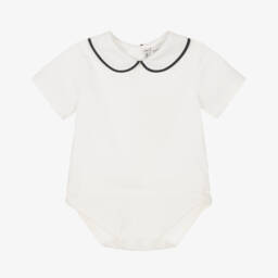 Baby boys and girls ivory bodysuit by Rachel Riley. It is made in soft cotton poplin, with a rounded collar, edged in red piping. It fastens neatly at the back with buttons. The attached lower half is made in a comfortable stretchy cotton jersey and has poppers between the legs for quick and easy changing.