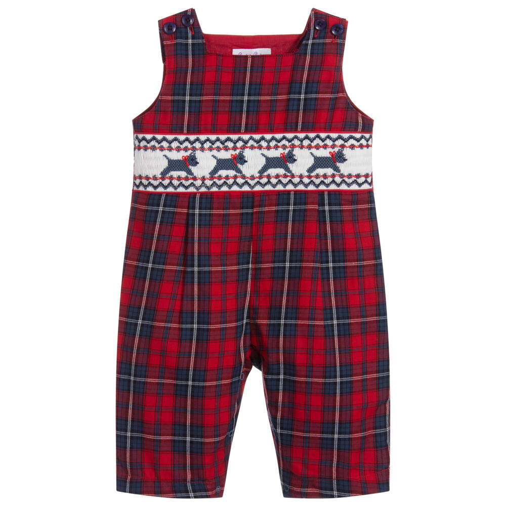 Adorable red and navy blue tartan dungarees for baby boys by Rachel Riley. They are beautifully smocked across the chest with cute Scottie dogs hand-embroidered in blue. Lined in lightweight navy blue cotton, they have adjustable, button fastening shoulder straps.