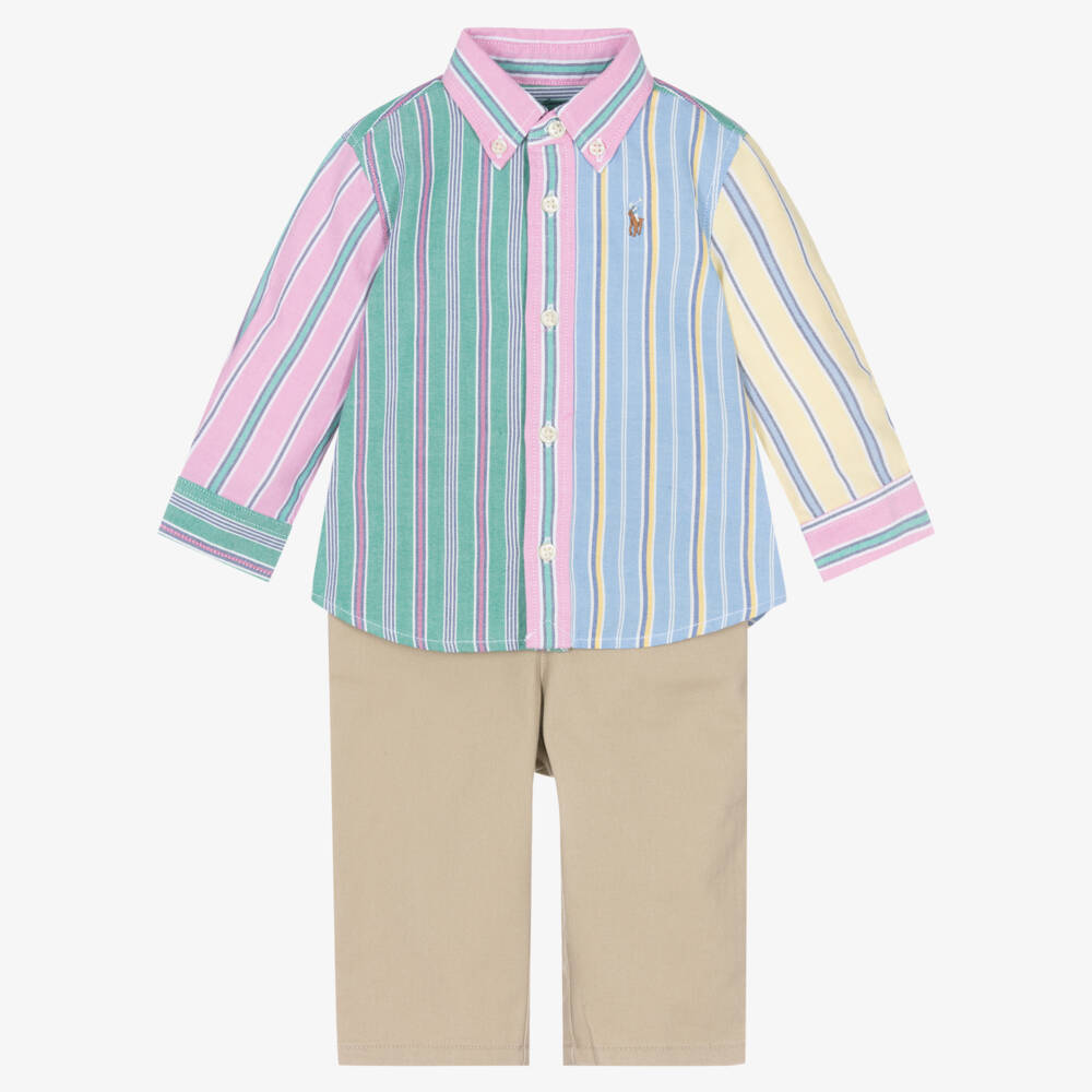 Smart casual trouser set for baby boys by American designer Ralph Lauren, made in lightweight cotton. The striped, multi-coloured shirt has the brand's signature pony logo embroidered on the chest in brown and fastens with buttons on the collar, front and cuffs. The beige chino trousers have a button fastening on the waistband, which has a comfortable elasticated section on the back for a good fit. The brand's signature pony logo is embroidered in navy blue above the button-down back pocket.