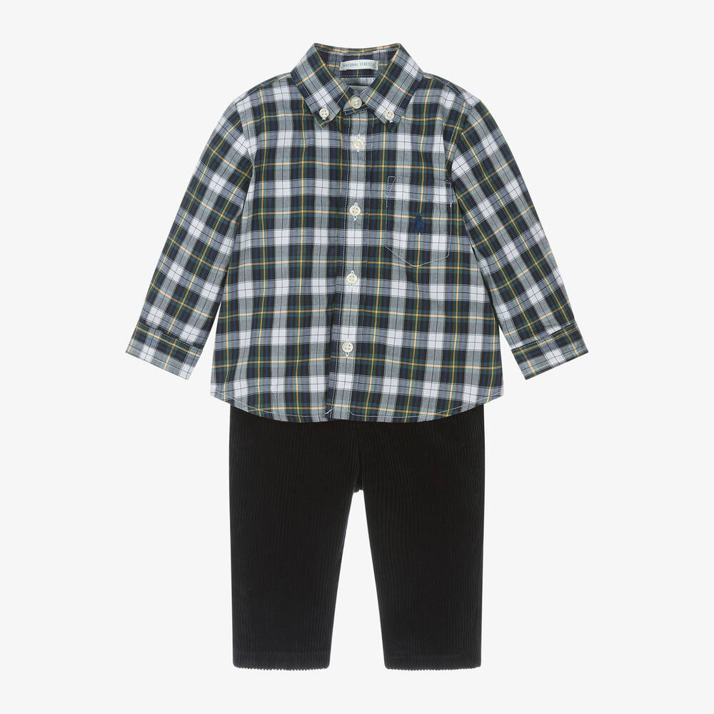 A smart navy blue cotton trouser set for baby boys by Ralph Lauren. Made in lightweight poplin, the long-sleeved shirt has a blue and green check design, with a button down collar and a chest pocket. The navy blue corduroy trousers have pockets on the front and back and a partially elasticated waistband with a button fastening on the front. Both pieces feature the brand's signature pony logo embroidery for designer appeal.