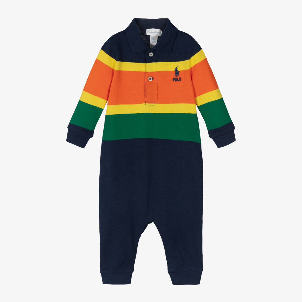 Baby boys blue striped romper by Ralph Lauren, with navy blue polo logo embroidery. Made in soft and stretchy cotton piqué, this cute onesie has colourblock stripes in yellow, orange and green. There are buttons to fasten down the front and poppers between the legs for easy dressing and changing.