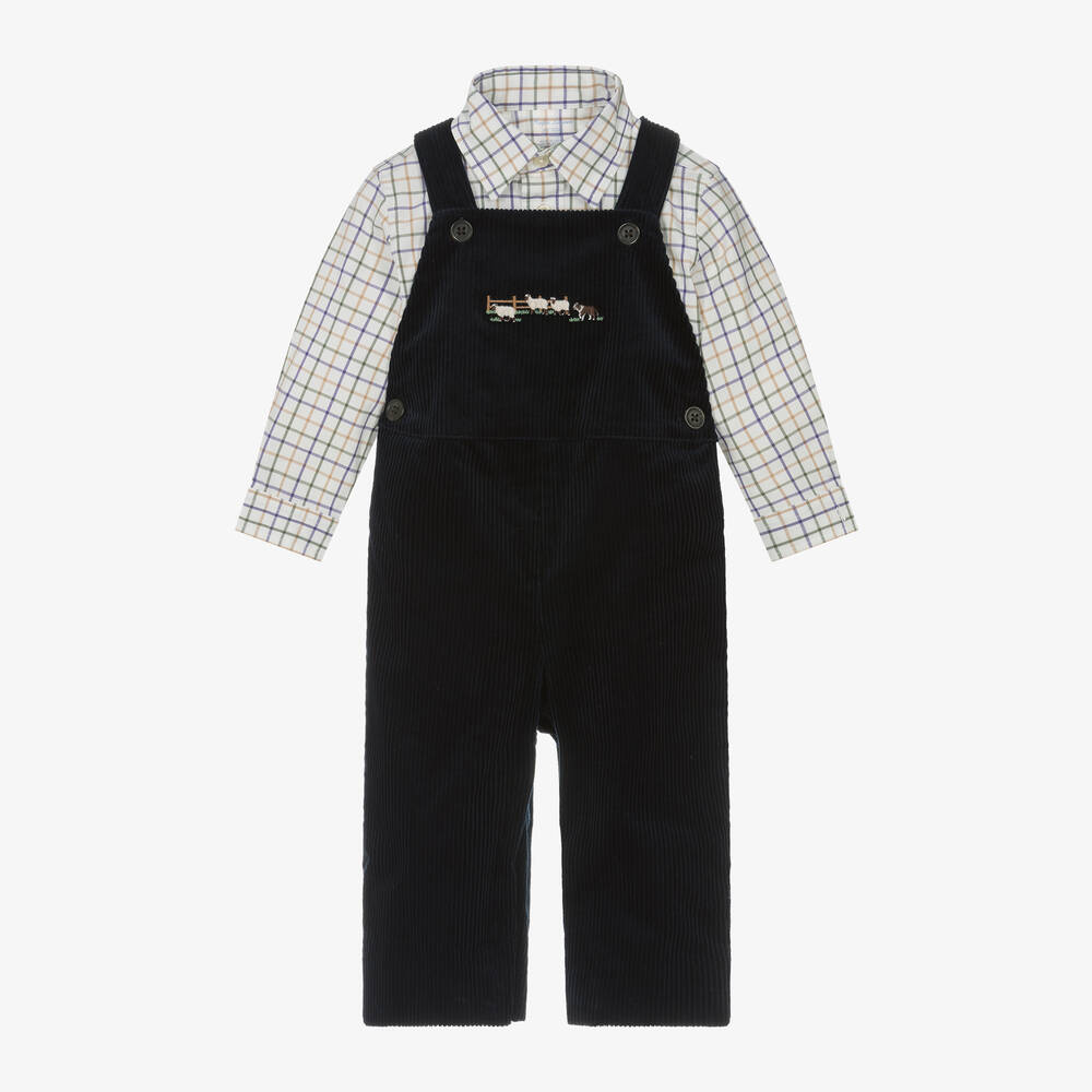 Navy blue cotton dungaree set for baby boys by Ralph Lauren. Made in soft corduroy, the dungarees are lined with comfortable jersey and button neatly on the shoulder straps. The back of the waistband is gently elasticated and the bib front is embroidered with farmyard sheep and a herding dog. Concealed poppers fasten between the legs to help with changing. The checked white shirt has a collared neck and discreet logo embroidery on the cuff. It has long sleeves with buttoned cuffs and a curved hem for a more casual feel.