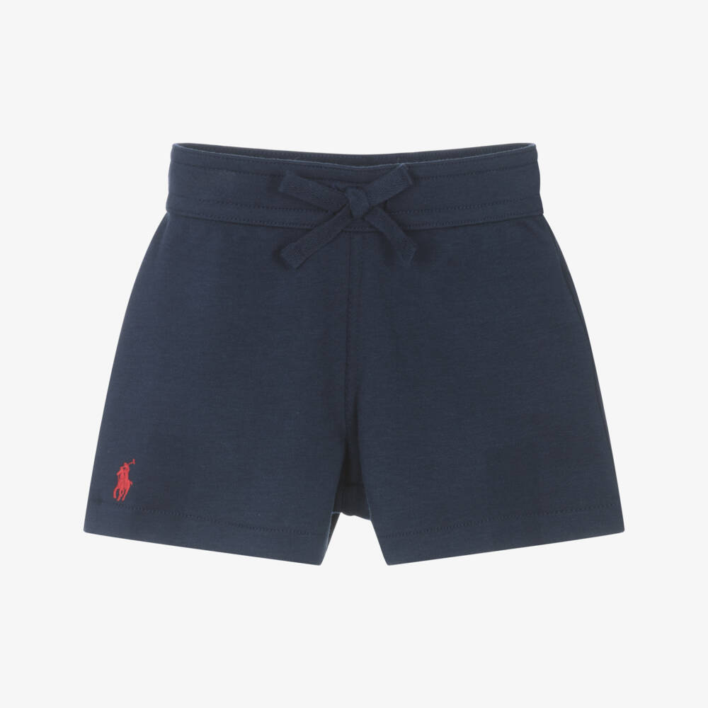Navy blue shorts for baby boys by Ralph Lauren, made in soft cotton jersey. They have a button fastening pocket on the back, a fixed bow trim on the front of the waistband and the brand's signature pony logo embroidered on one leg in red