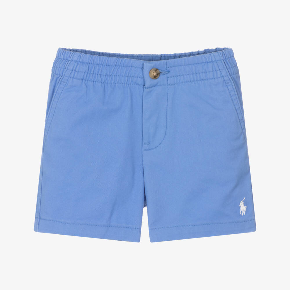 Bright blue shorts for baby boys by Ralph Lauren, made in soft cotton twill with a slight stretch for comfort. Ideal for everyday casual wear, they have front and back pockets, a gently elasticated waistband and a button and zip fastening. An embroidered white pony logo adds instant designer appeal.