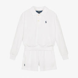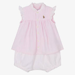 A casual blue and green striped shorts set for baby boys by Ralph Lauren. Made in soft cotton jersey, the T-shirt is printed with the designer's iconic Polo Bear on the front, and has shoulder poppers to help with dressing. The coordinating shorts have an elasticated waist for a comfortable fit, with a faux drawstring detail.