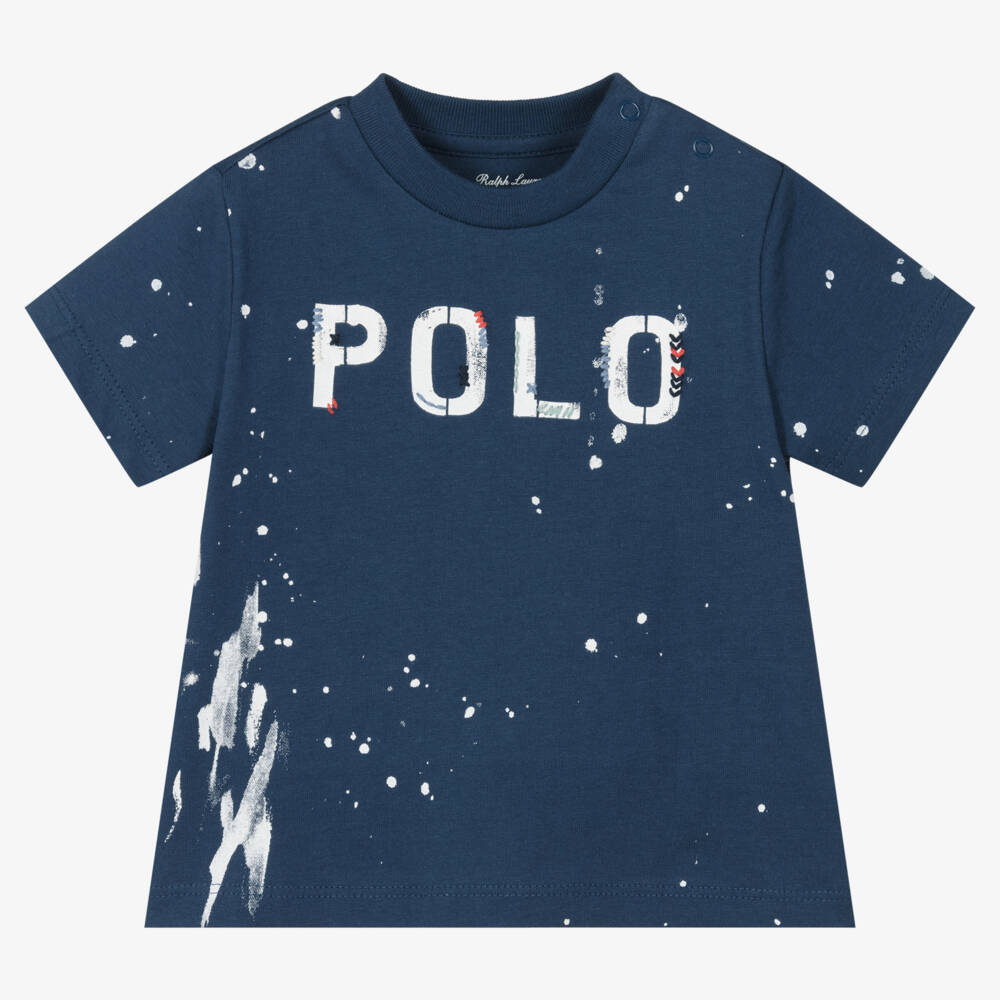 Navy blue T-shirt for baby boys by Ralph Lauren, made in soft cotton jersey. This crew neck T-shirt has a stencilled effect logo on the front with cross stitch detailing on the letters. It has a fun, all-over paint splatter design and popper fastenings on one shoulder to help with dressing.