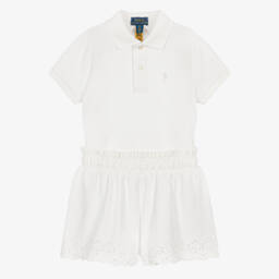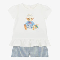 Green polo shirt and blue shorts set for baby boys by Ralph Lauren, made in soft and comfortable cotton piqué. The short-sleeved top has classic polo styling with a ribbed collar, button fastenings and an embroidered signature Pony logo on the chest. Patterned with colourtful, embroidered logos, the contrasting shorts have an elasticated waistband and front pockets.