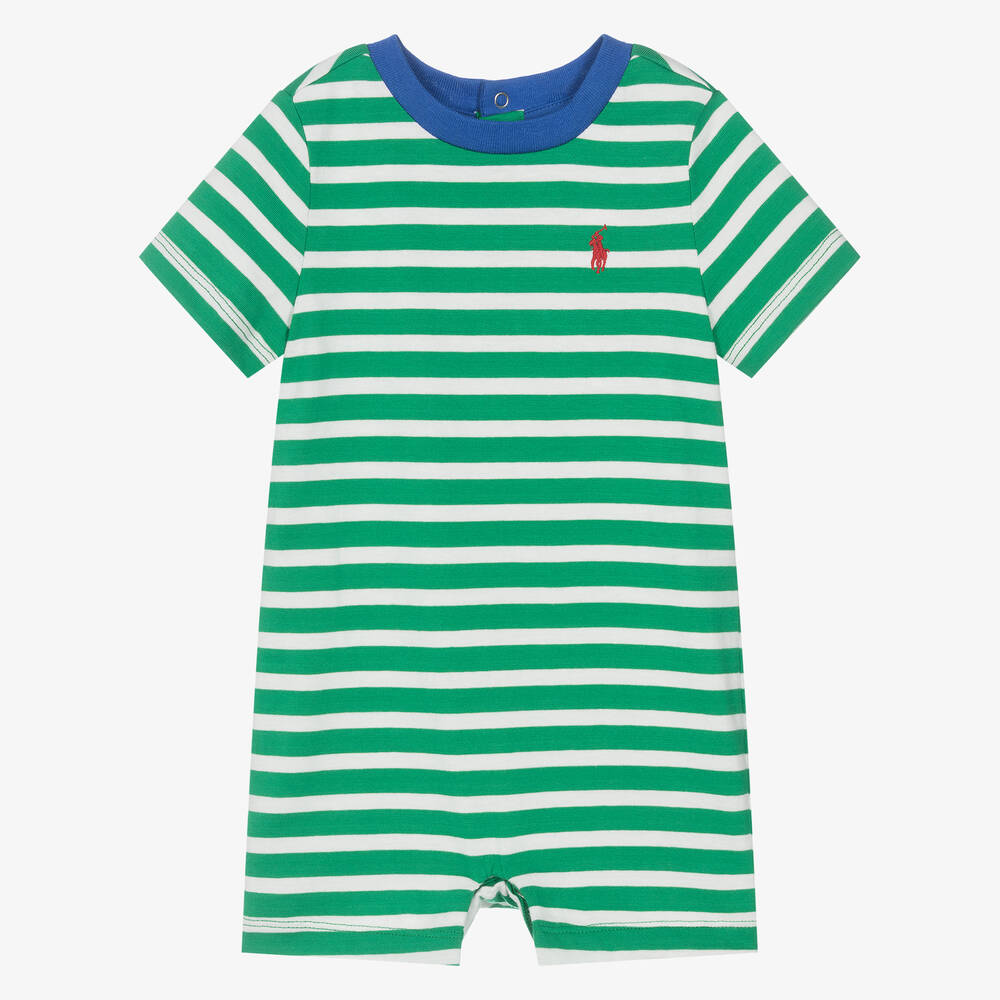 Green and white striped shortie for baby boys by Ralph Lauren, made in soft cotton jersey with a contrasting blue neckline. Cute and comfortable, it has popper fastenings on the back and between the legs, with the signature pony logo embroidered on the chest in red.