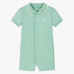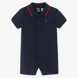 Navy blue shortie for baby boys by Ralph Lauren, made in soft cotton jersey. Designed for comfort, it has a ribbed collar with a contrasting red stripe, and the brand's signature Pony logo is embroidered on the chest. There are poppers on the front and between the legs to help with dressing.