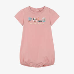 A navy blue, green and pink striped cotton shortie for baby boys by Ralph Lauren. Made in soft, comfortable cotton jersey, it is designed in the style of a T-shirt with a crew neck and short sleeves, with the brand's signature pony logo embroidered on the chest in navy blue.