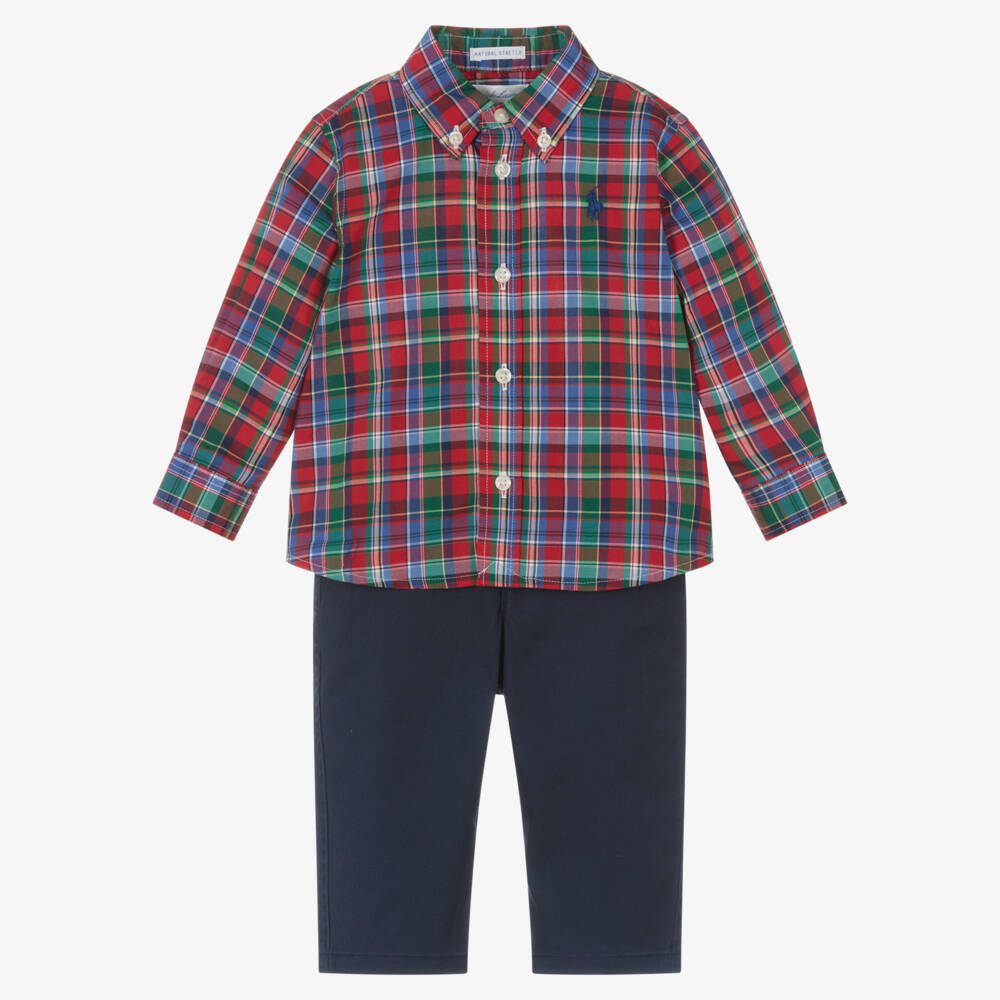A smart, yet casual cotton shirt and trouser set for baby boys by Ralph Lauren. The lightweight poplin shirt is patterned with a red check incorporating shades of blue and green. It fastens with buttons on the collar, cuffs and down the front. The navy blue twill trousers have useful pockets on both the front and back. They fasten with a button at the front and are partially elasticated for a comfortable fit. A small pony logo is embroidered on both pieces for a signature designer finish.