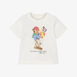 This off-white T-shirt for baby boys by Ralph Lauren features the brand's iconic bear graphic on the front with a nautical theme. Made from soft cotton jersey, it has a comfortable crew neckline with branded popper fastenings on one shoulder to help with dressing.