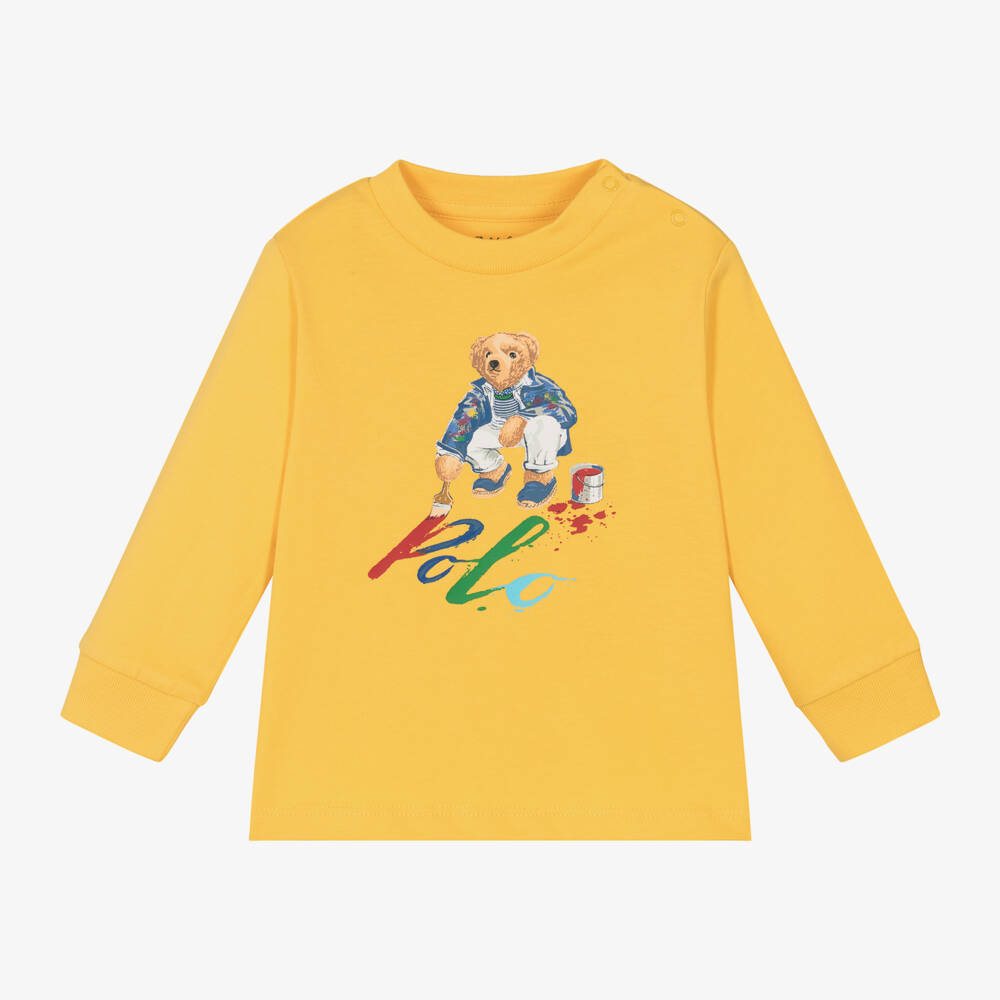 Yellow top for baby boys by Ralph Lauren, made from soft cotton jersey. Fastening with poppers on the shoulder, this long-sleeved top has the brand's beloved Polo Bear printed on the front for a signature look. It has lightly ribbed cuffs and a crew neckline to ensure comfortable wear.