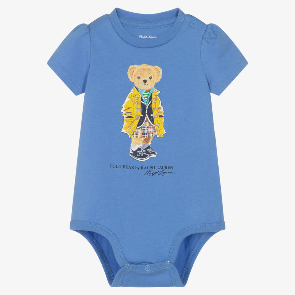 Super cute blue cotton bodyvest for baby girls by Ralph Lauren, with the brand's bear printed on the front in yellow and blue. Made in comfortable jersey, it has pretty puffed sleeves and easy-to-use popper fastenings on one shoulder and between the legs, so it never becomes untucked.
