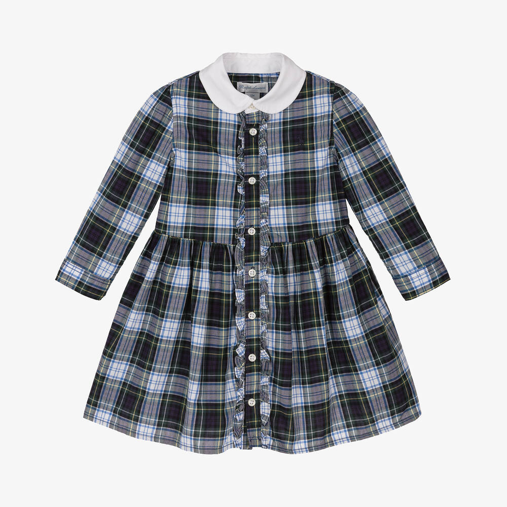 From Ralph Lauren, a tartan shirt dress for baby girls, in navy blue, white and green. Woven in soft and lightweight cotton, this preppy style has button fastenings on the front and cuffs, with pretty ruffle trim and a contrasting white collar. The signature pony logo is embroidered on the chest and the dress comes with matching knickers to complete the look.