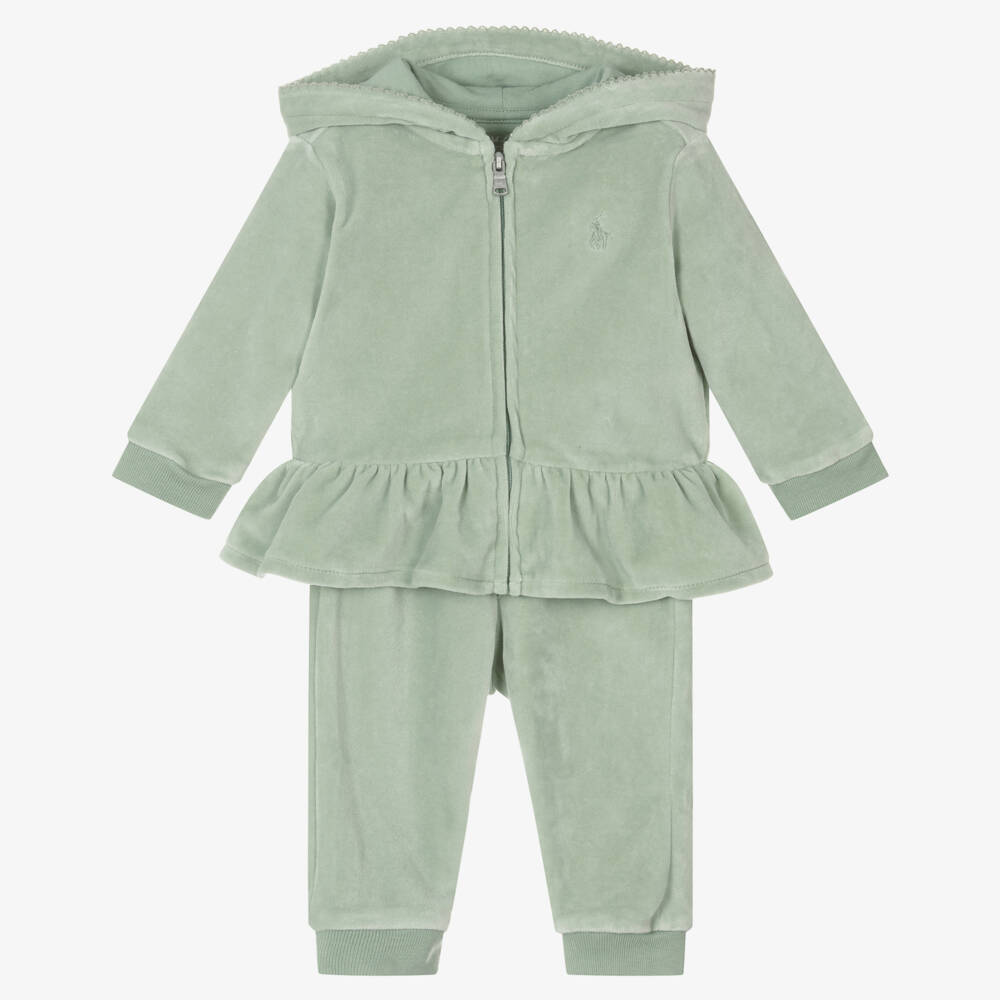 Cosy green hooded tracksuit for baby girls by Ralph Lauren, made in soft cotton velour. The zip-up top has a frilled hem and a hood lined with cotton jersey for comfort, finished with a pretty picot trim. An embroidered tonal pony logo on the chest gives a subtle designer touch. The matching joggers have ribbed cuffs and a comfortable elasticated waistband with a fixed drawstring tie.