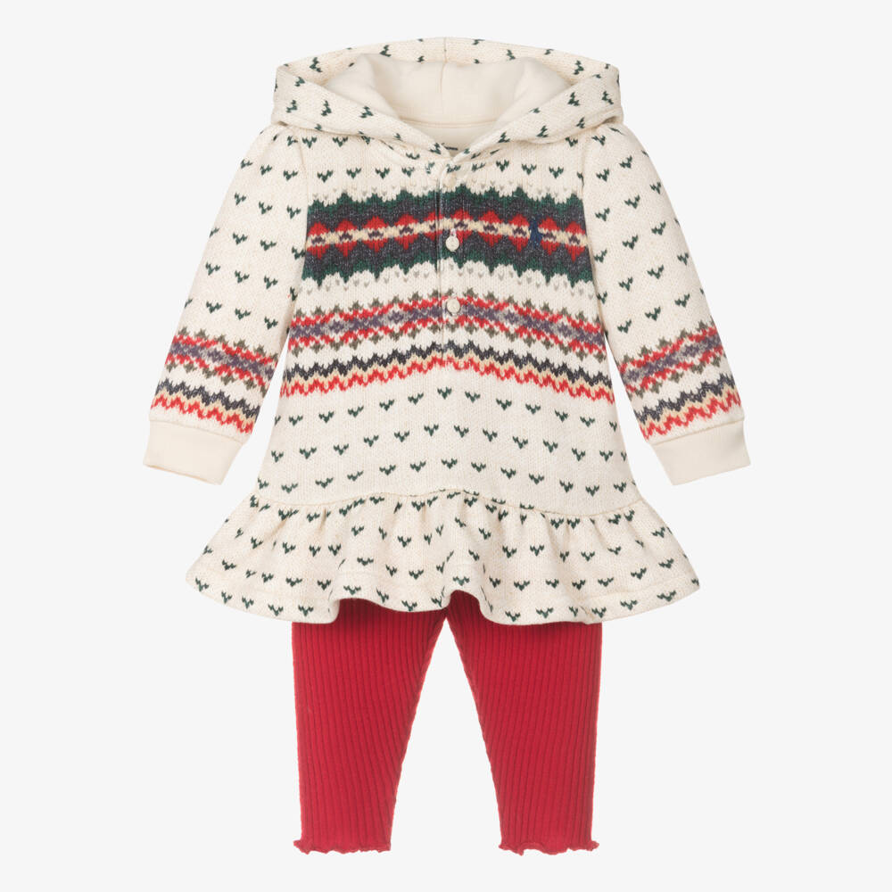 Ivory and red leggings set for baby girls by Ralph Lauren. In a lovely red, blue and green knit effect, the hooded top is made in soft cotton blend jersey, with a fleecy inside for an extra cosy feel. It has lightly ribbed cuffs, a pretty frilled hem and fastens on the front with buttons. The coordinating red ribbed jersey leggings, have pretty frilled cuffs and a gently elasticated waistband. An embroidered pony logo on the front adds a subtle designer finish.