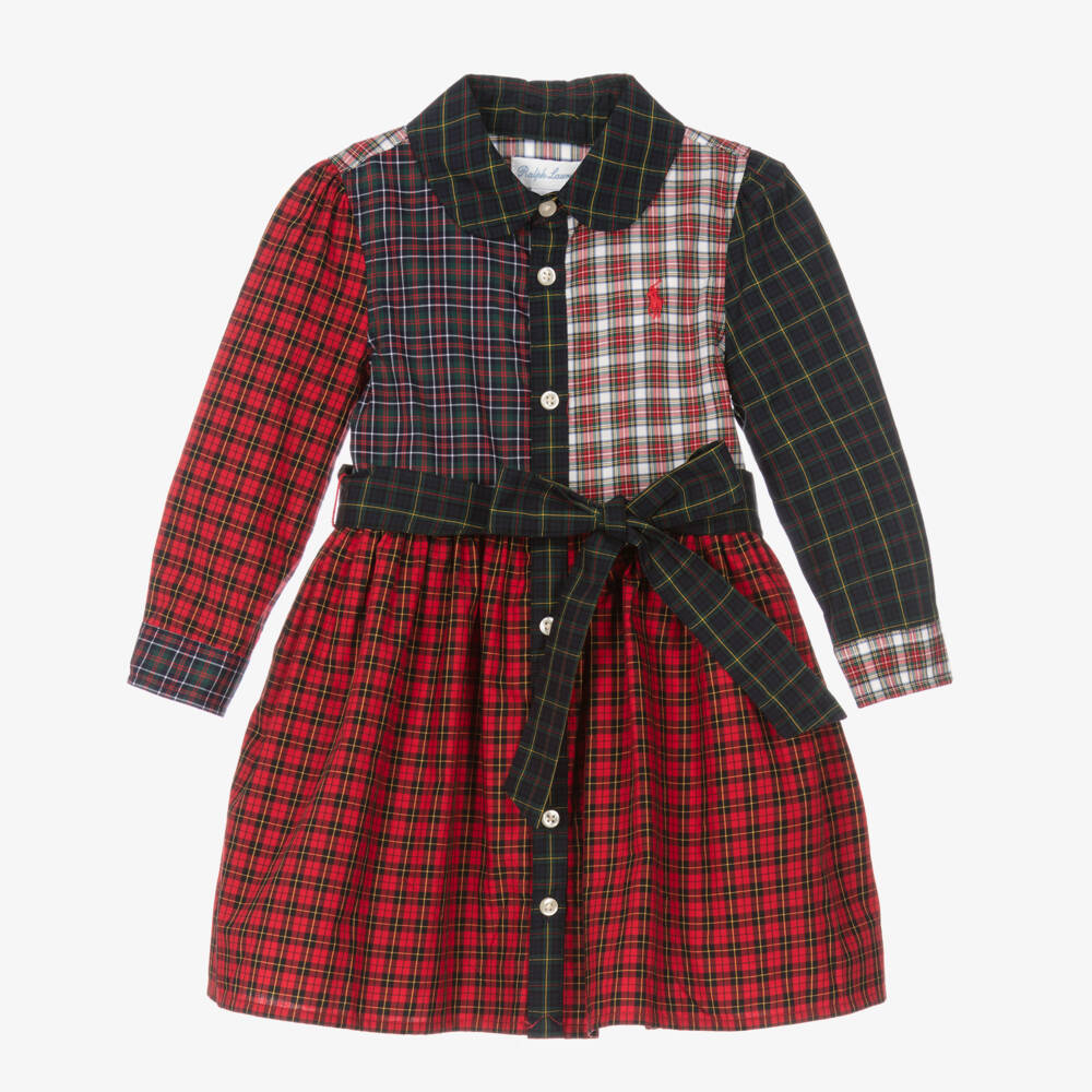 A charming red and navy blue cotton shirt dress for baby girls by Ralph Lauren. Soft and lightweight, this cotton dress is created out of a medley of plaid patterns with a signature red pony logo embroidered on the chest. Fastening with buttons on the front, it has a sweet Peter Pan collar, a detachable waist tie belt, and comes with matching elasticated knickers.