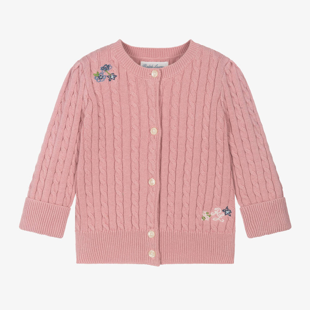 Rose pink cardigan for baby girls by Ralph Lauren, knitted in soft cotton. This cable knit layering piece is delicately embroidered with sweet flowers and fastens with classic buttons on the front. The designer's initials are discreetly embroidered in white near the hem, signing off the look with a touch of branding.