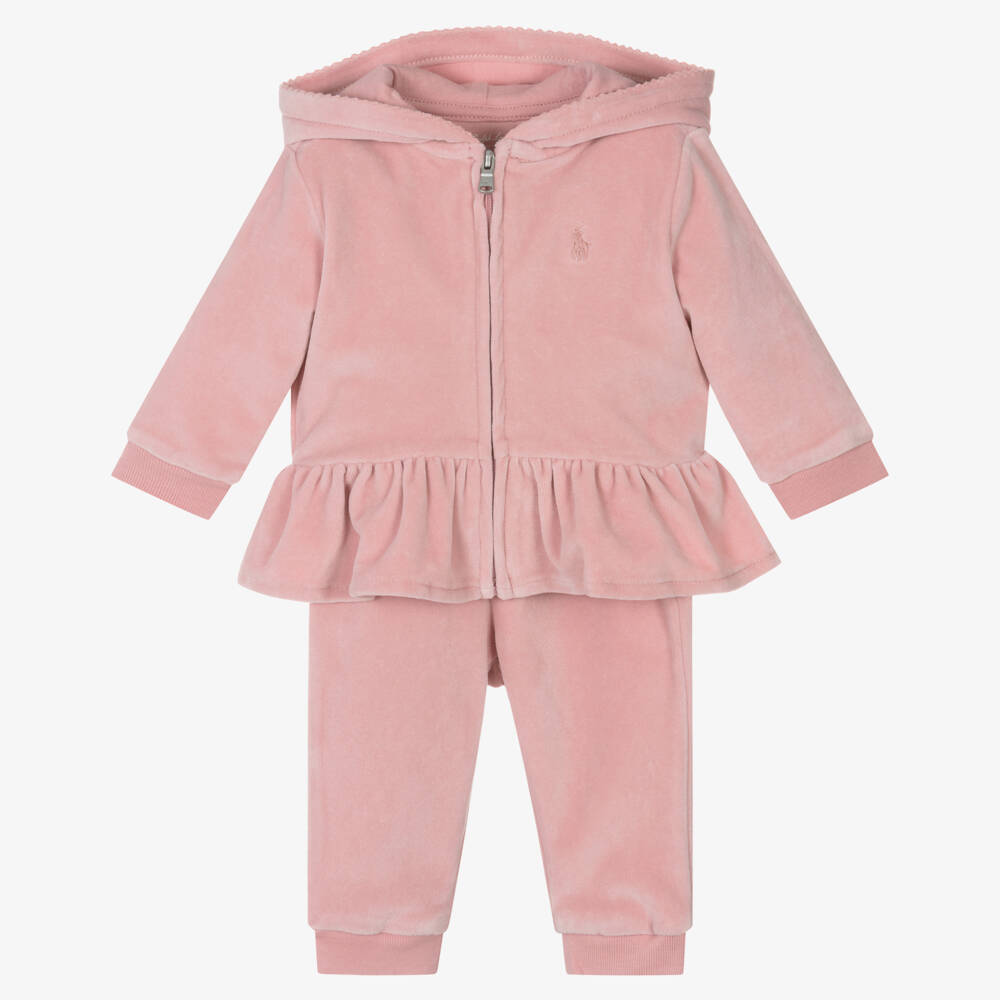 Cosy pink hooded tracksuit for baby girls by Ralph Lauren, made in soft cotton velour. The zip-up top has a frilled hem and a hood lined with cotton jersey for comfort, finished with a pretty picot trim. An embroidered tonal pony logo on the chest gives a subtle designer touch. The matching joggers have ribbed cuffs and a comfortable elasticated waistband with a fixed drawstring tie.