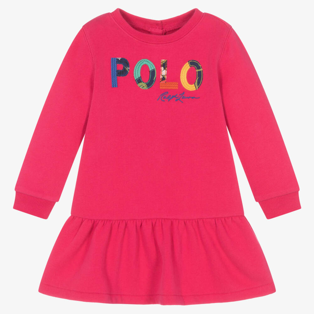 Casual fuchsia pink jumper dress for baby girls by Ralph Lauren, made in sweatshirt jersey with a fleecy inside. Soft against delicate skin, it has a stylish dropped waist, cosy ribbed trims and has a vibrant, tropical-theme multicoloured logo embroidered on the chest for a distinctive branded look. It fastens with buttons on the back. The matching knickers have an elasticated waist and trims for comfort.